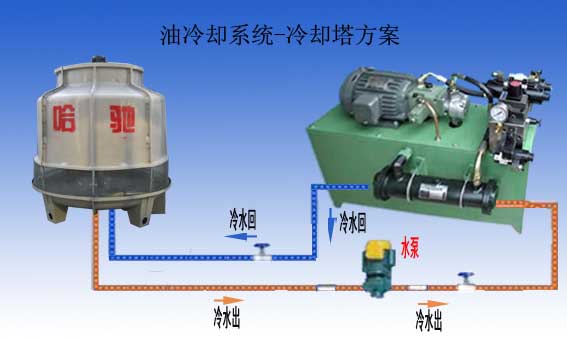 下面的方案就是選用工業(yè)冷卻塔來(lái)冷卻油溫,工作流程示意圖請(qǐng)參照以下圖片示例: